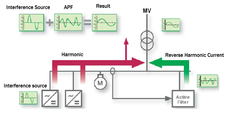 فیلتر هارمونیک اکتیو 150 آمپر مدل CM-APF-400-150A مولتی‌ متریکس که به صورت موازی با شبکه برق قرار دارد، می‌تواند موج هارمونیک را در شبکه برق به موقع تشخیص دهد، جریان جبران فاز معکوس را از طریق مبدل تولید کند و به صورت پویا موج هارمونیک را در شبکه برق فیلتر کند.